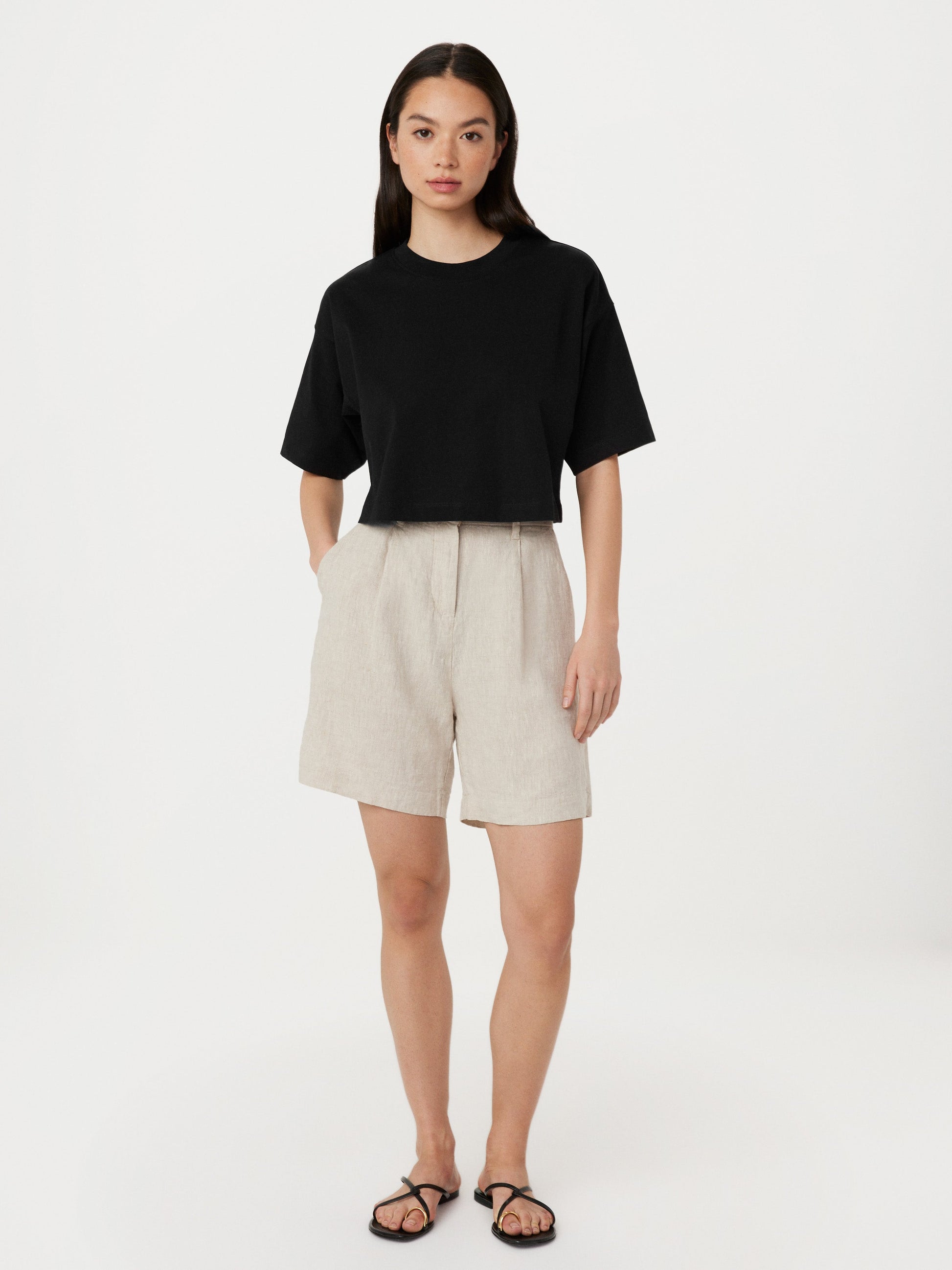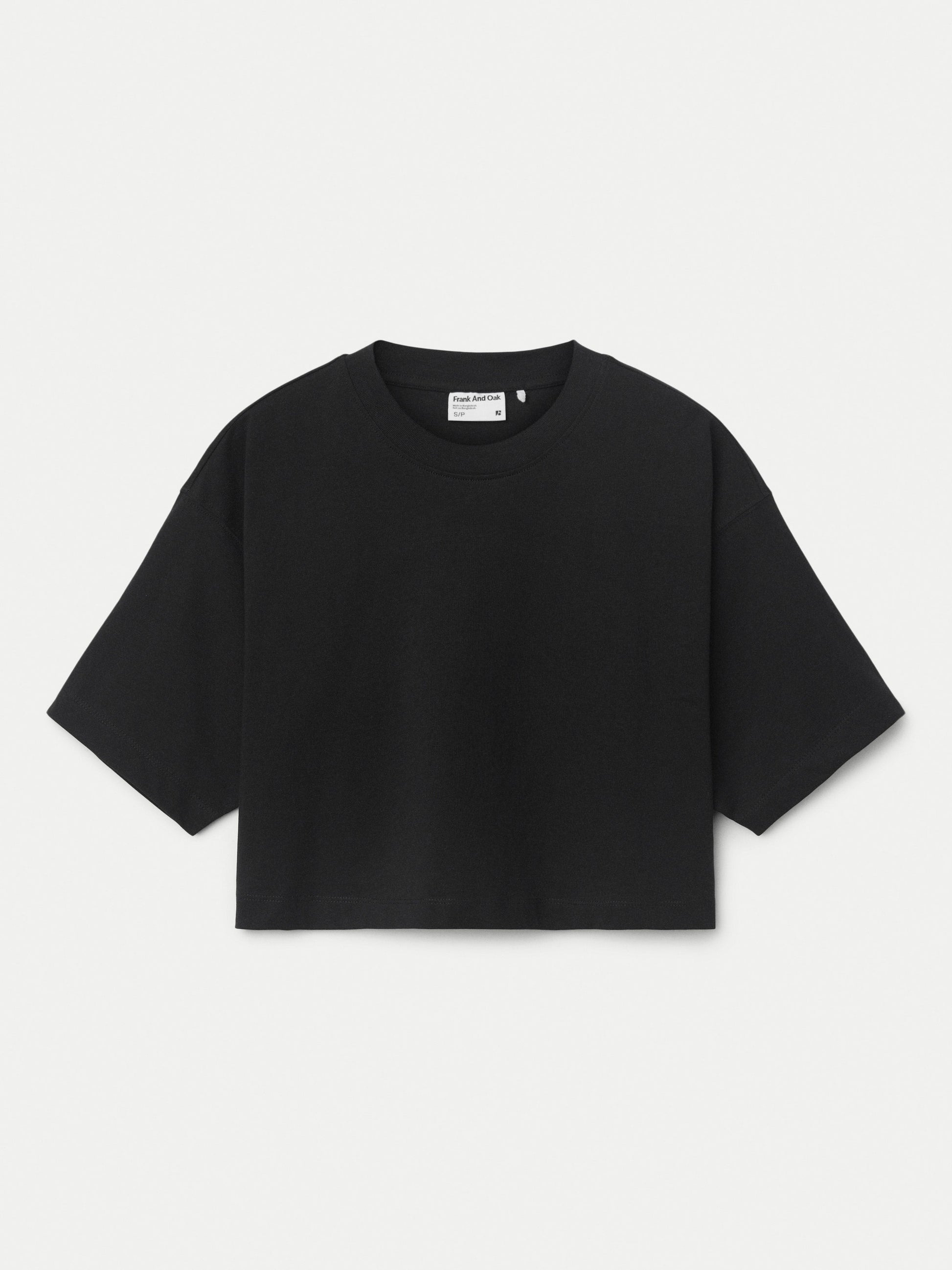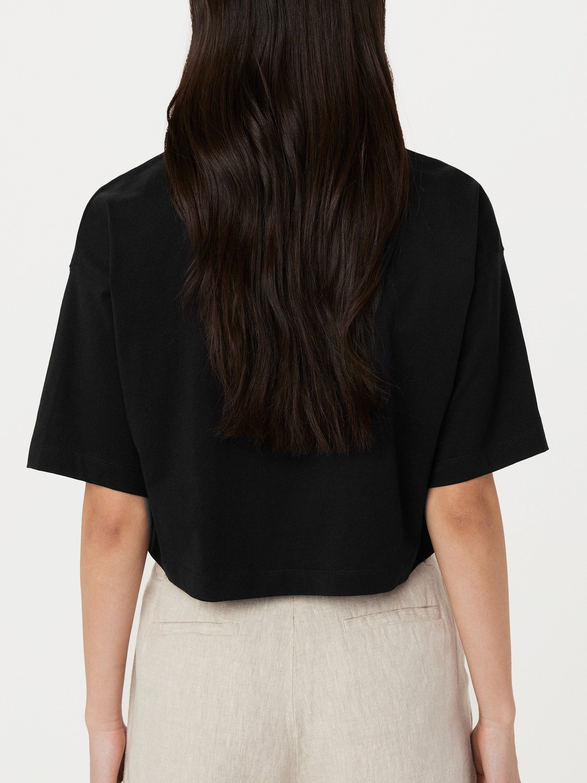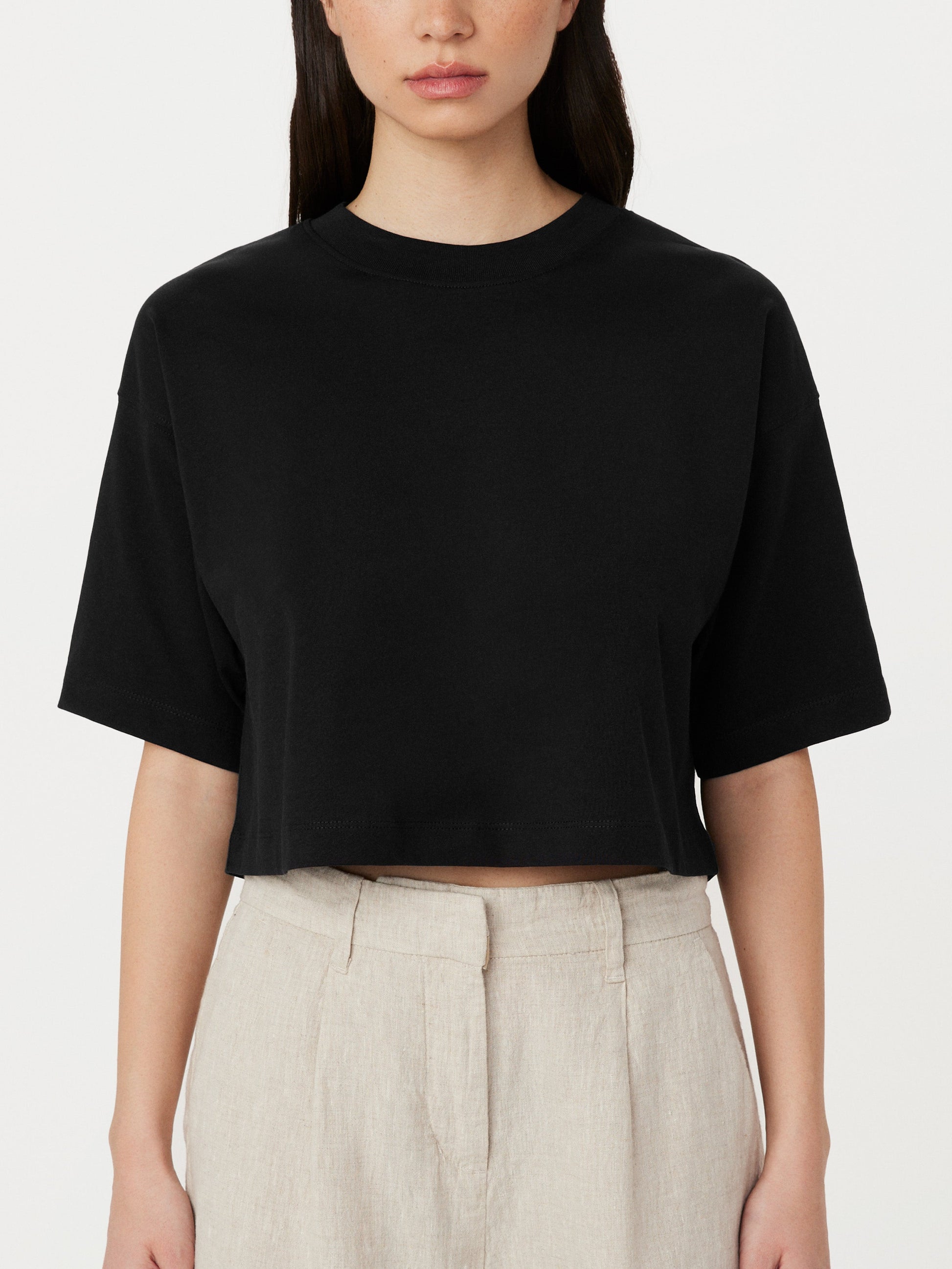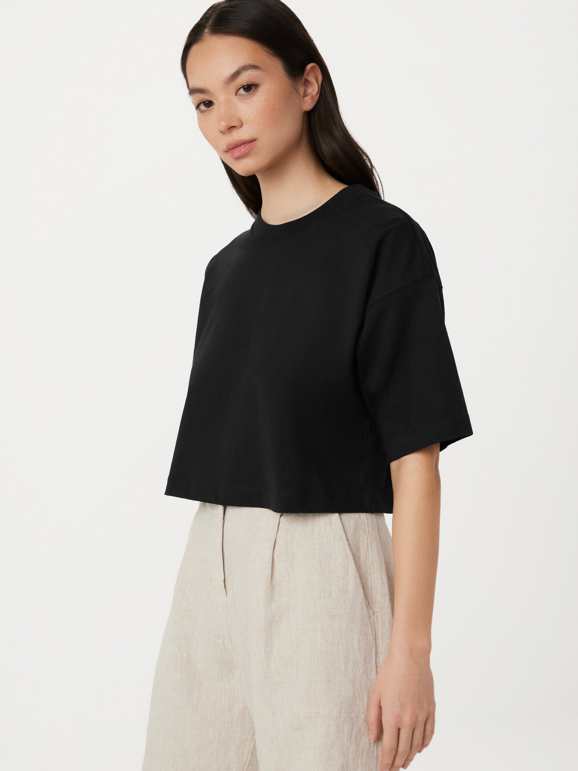 A wardrobe essential. This cropped T-shirt is made from an organic cotton jersey with a slightly thicker feel. Boxy, ample fit. Dropped shoulders. Features a longer, wide sleeve. Crewneck.