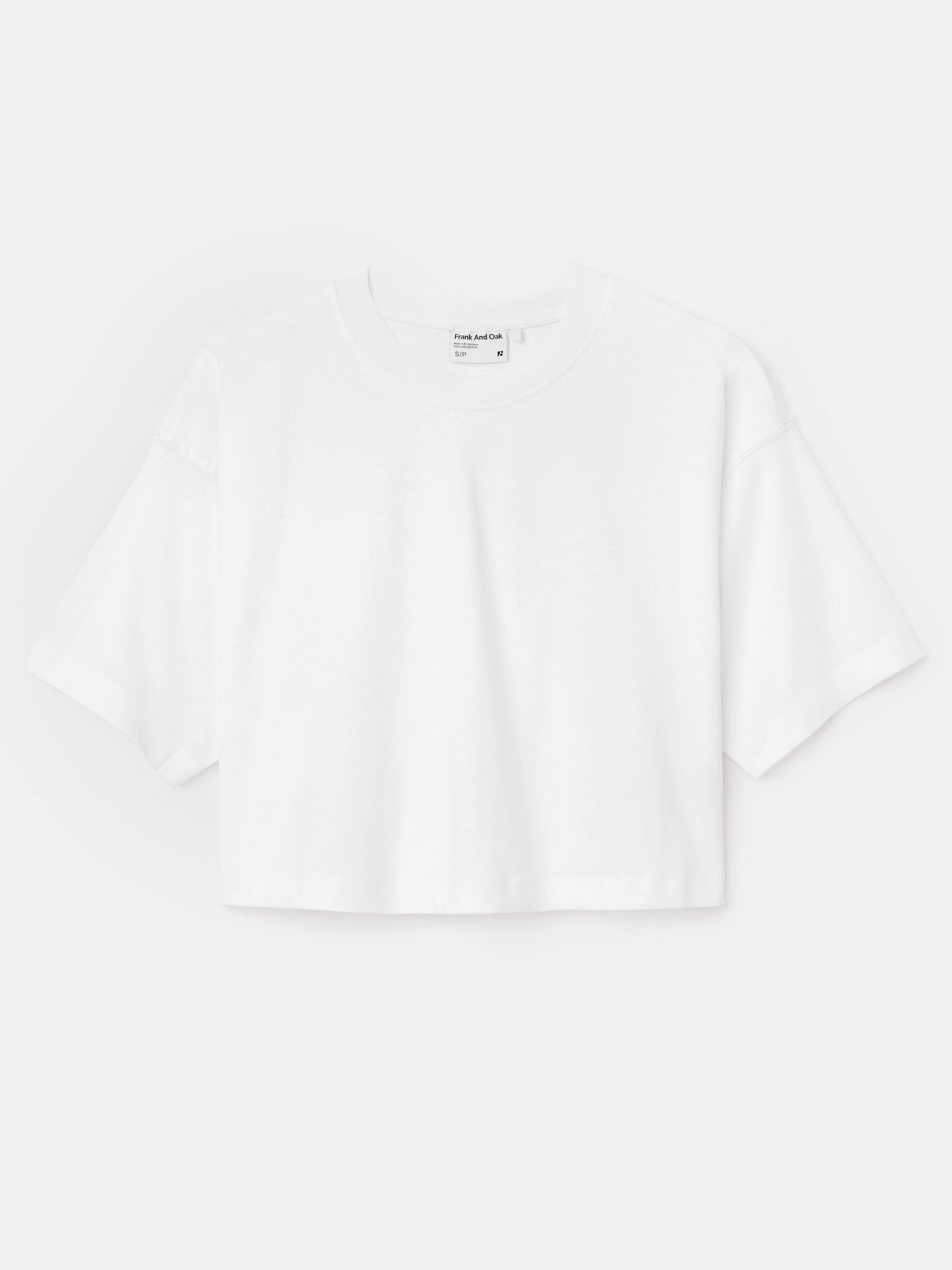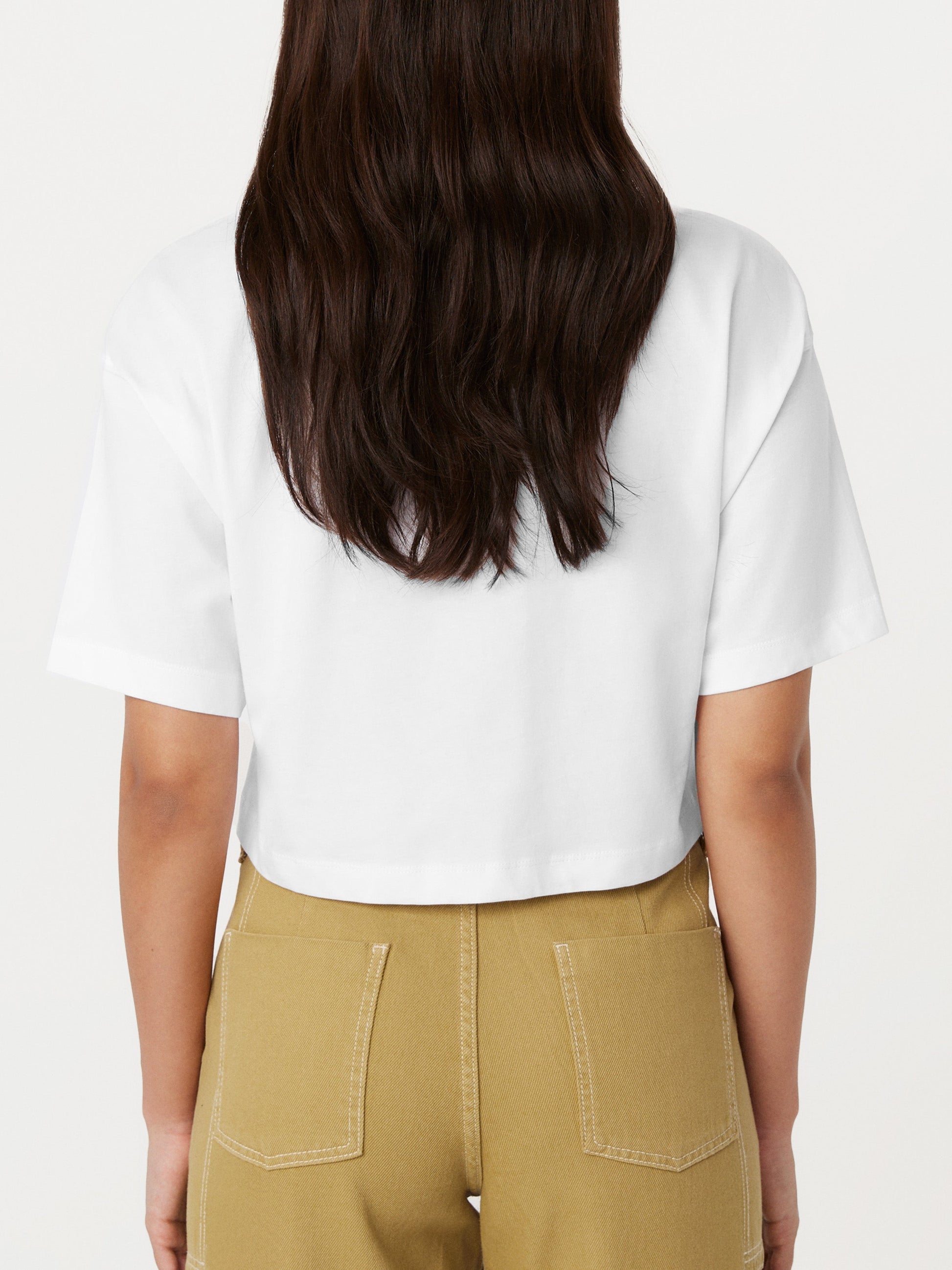 A wardrobe essential. This cropped T-shirt is made from an organic cotton jersey with a slightly thicker feel. Boxy, ample fit. Dropped shoulders. Features a longer, wide sleeve. Crewneck.
