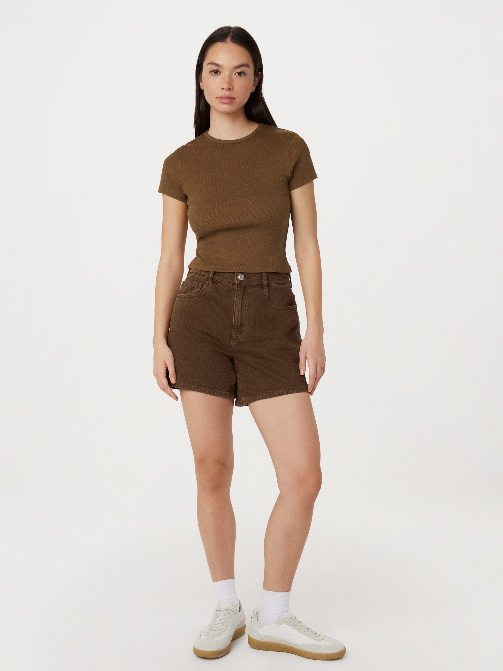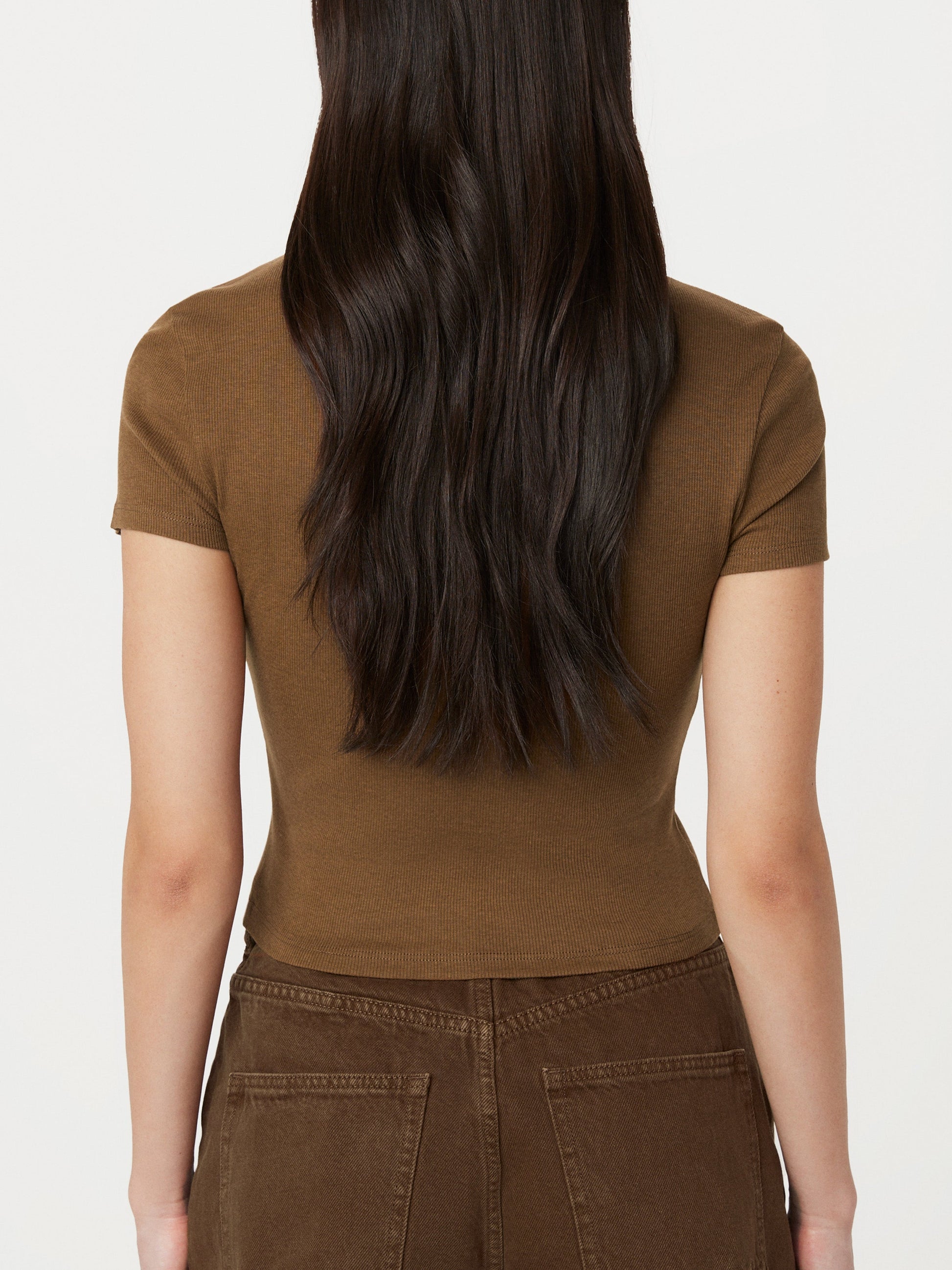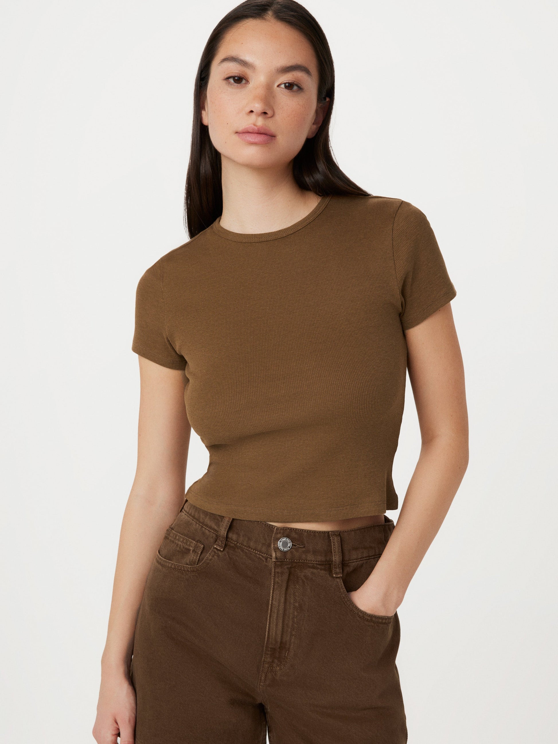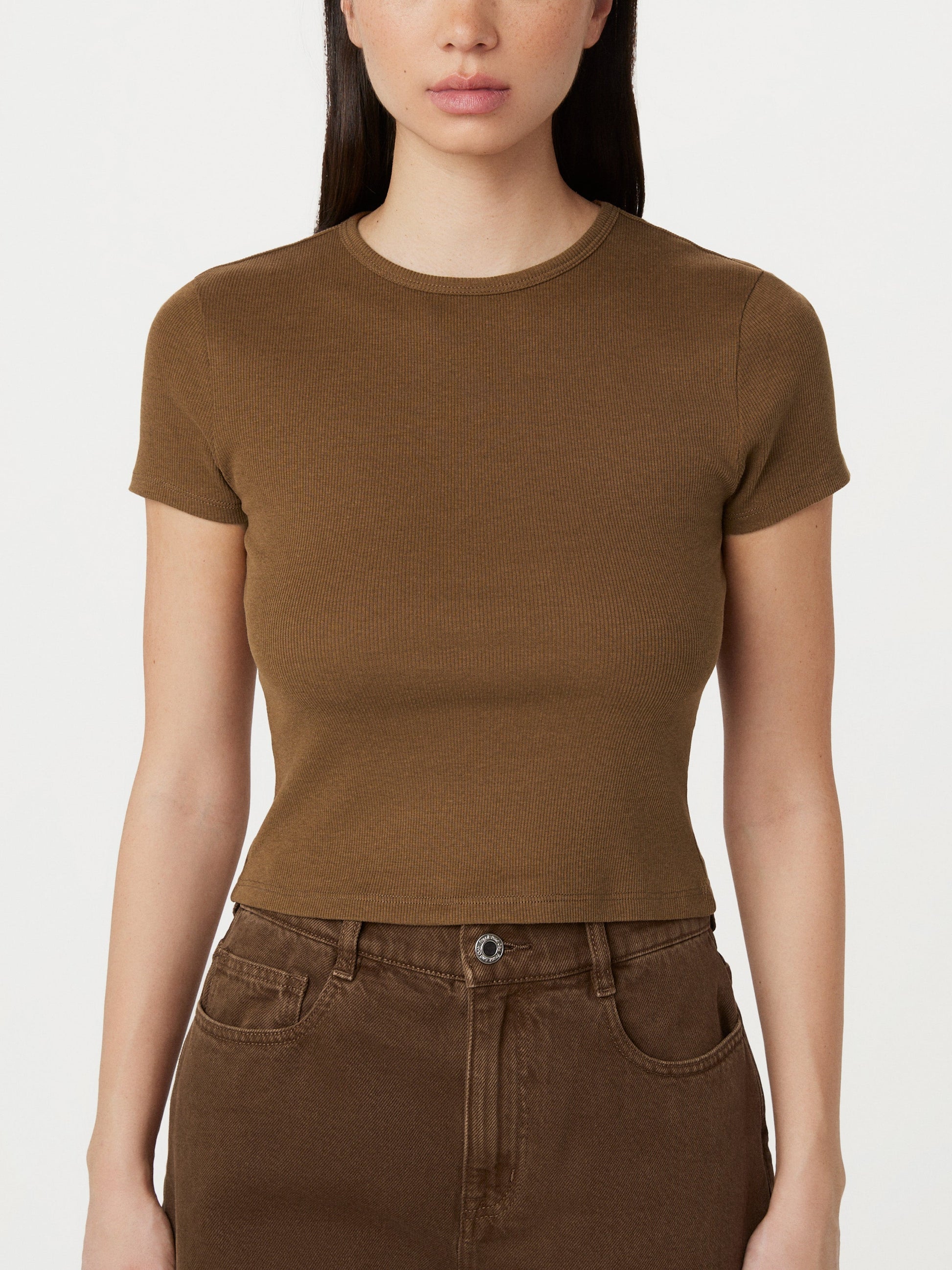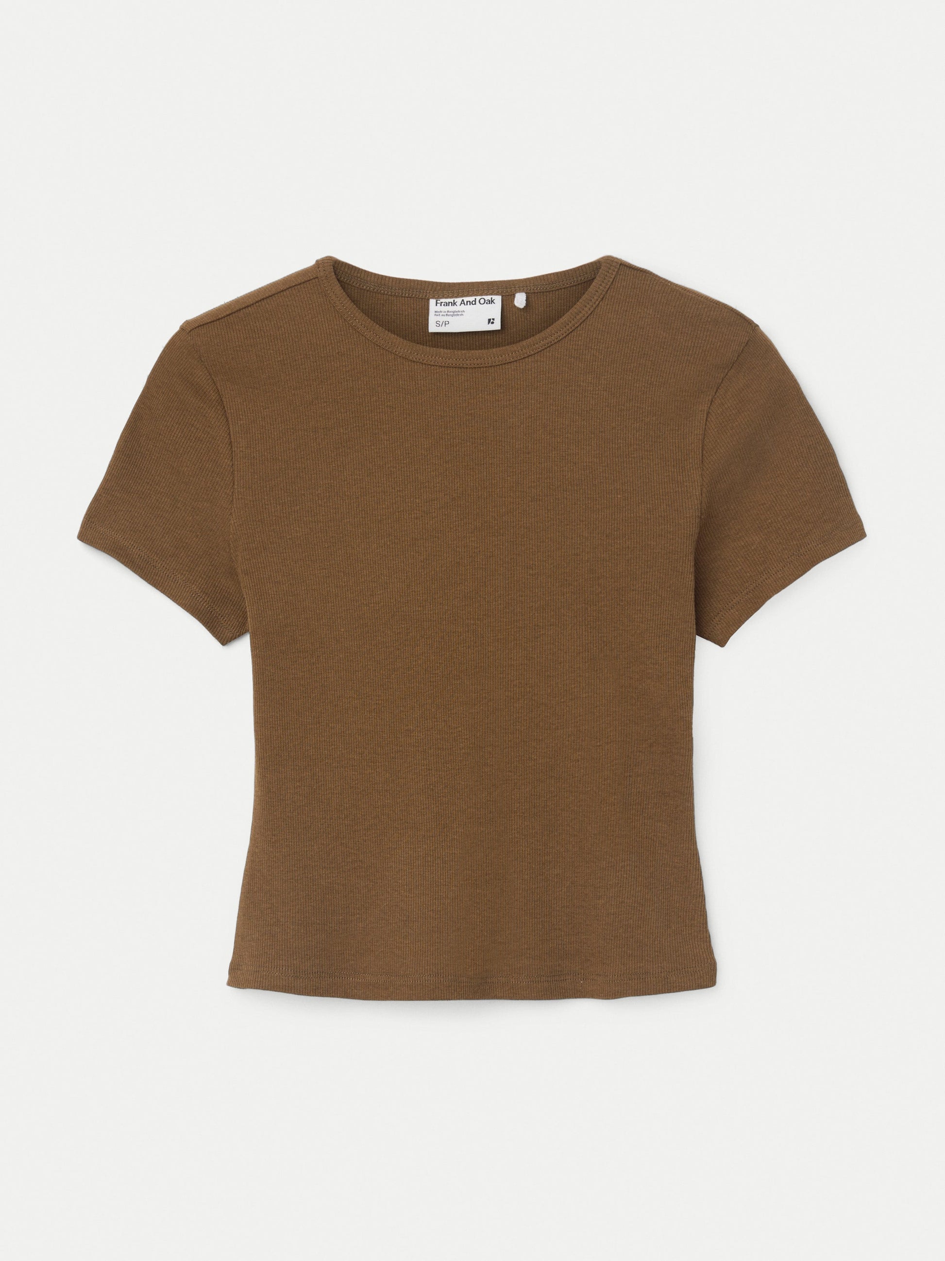 Bring back the 90s. This shrunken T-shirt is made with a blend of organic cotton, TENCEL modal, and a bit of stretch for easier moves. Features an all-over small rib. Slim fit. Short sleeves. Cropped length. Crewneck.