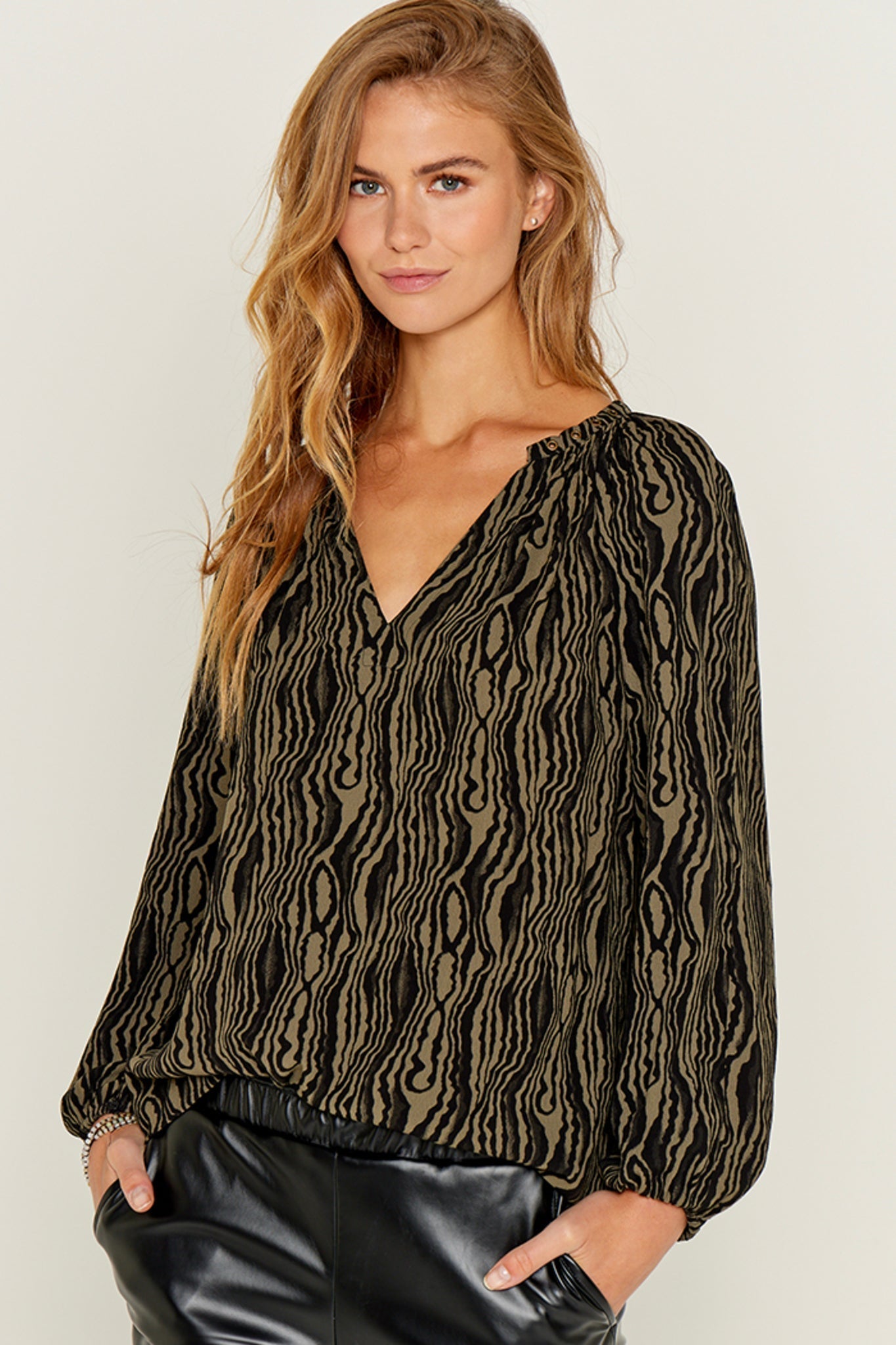 Five Jeans classic pull-on shirt BICHE with round split neck with eyelet detail. It has long blouson sleeves and the fabric is khaki green with bark like print in black. Team with leather pants and heel boots to give yourself that rock chic edge.
