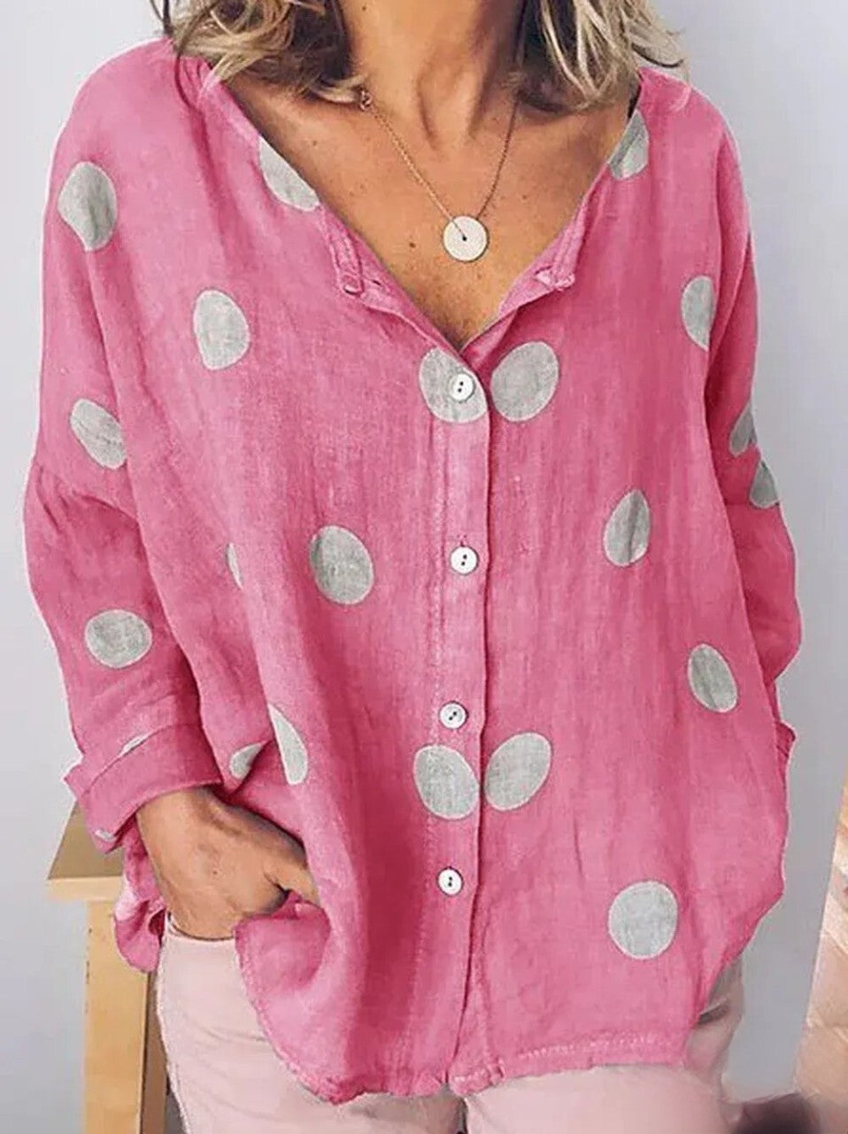 Add a hint of sophistication and charm to your wardrobe with the *Sophia Long Sleeve Polka Dot Shirt* – a must-have staple that pairs effortlessly with any look.