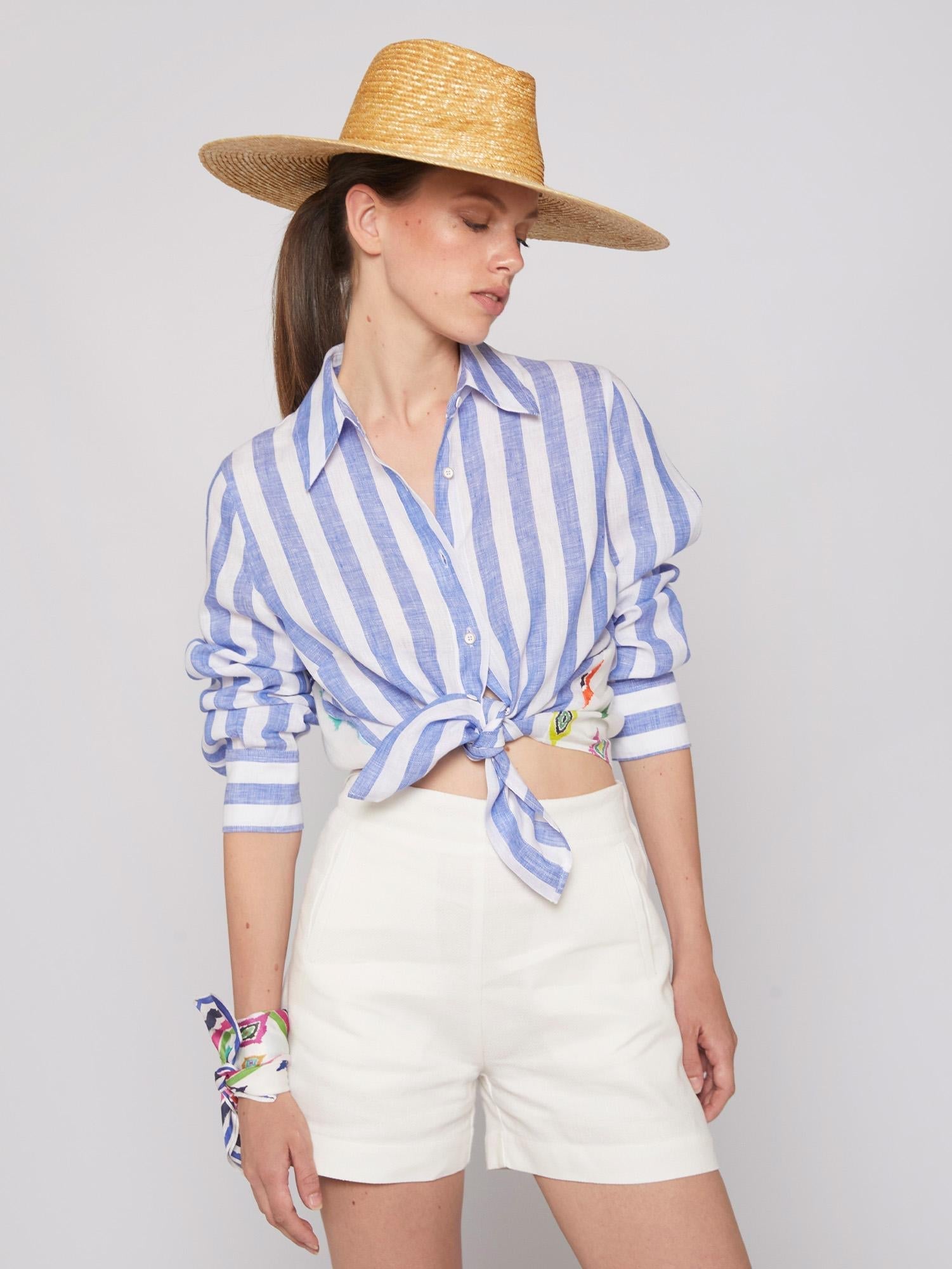 Indulge in the luxurious Vilagallo MAFALDA Linen Stripe Shirt for women. This stylish piece features bold blue stripes on the front, complemented by a vibrant multicolored pattern on the back. Adorned with long sleeves and buttoned cuffs, it exudes elegance and sophistication. Perfect for a breezy summer day, pair it with jeans or linen shorts for a chic look.